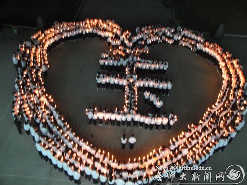 文学院2009级715名学生举行了“中国心含玉——为玉树灾区同胞祈福捐款仪式”。全场由人群组成的中国“心”和汉字“玉”的造型,在715束烛光的映照下,分外明亮。人群中一直回荡着歌曲《让世界充满爱》和《隐形的翅膀》深情悠扬的旋律,学生们纷纷伸出援手,尽自己的一份力量。