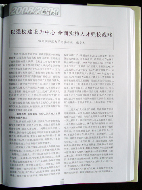 我校党委书记张少杰撰写的《以强校建设为中心 全面实施人才强校战略》一文被《中共黑龙江省委执政纪要2008~2009卷》收录。这是《中共黑龙江省委执政纪要》首次刊发高校领导相关内容的文章。