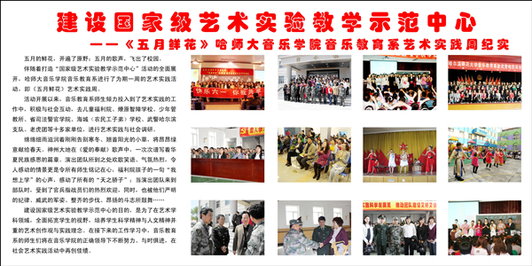 活动开展以来,音乐教育系师生倾力投入到了艺术实践的工作中,积极与社会互动,去儿童福利院、燎原智障学校、少年管教所、省司法警官学院、海城(农民工子弟)学校、武警哈尔滨支队、老虎团等十多家单位,进行艺术实践与社会调研。演出团队所到之处欢歌笑语、气氛热烈,动人情景更是令所有师生铭记在心。福利院孩子的一句“我想上学”的心声,感动了所有的“天之骄子”;当演出团队来到部队时,受到了官兵指战员们的热烈欢迎,同时,也被他们严明的纪律、威武的军姿、整齐的步伐、昂扬的斗志所鼓舞。