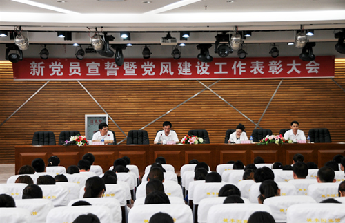 会上,进行了新党员宣誓活动;蒋晶洁宣读了学校党委《关于表彰2007—2009年度党风廉政建设工作先进集体、先进个人、优秀特邀监察员的决定》;对获奖的单位和个人进行了表彰奖励;新党员代表和党风廉政建设工作获奖代表分别在会上发言。