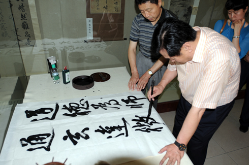 考察结束后,李蒙副主席与陈述涛副主任、王为正副书记亲切合影,并为我校文博馆题词留念。同行的著名书法家韩维国、著名画家赵俊生也现场挥毫泼墨,为我校文博馆题词留念。