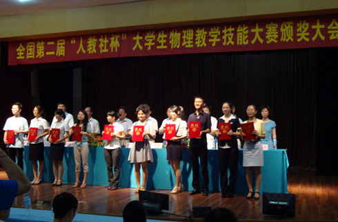 7月29日—31日在南京师范大学举行的第二届全国大学生物理教学技能大赛中,通过激烈的竞争,我校物理与电子工程学院参赛的8名学生脱颖而出,取得了优异的成绩,哈尔滨师范大学获得“优秀团体奖”,申迪、吴畏和朱云飞三名同学荣获个人一等奖;任鑫、李鑫和门武昭三名同学荣获个人二等奖;许媚和邵恒两名学生荣获个人三等奖。
