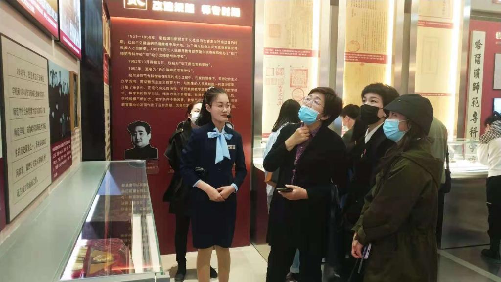 在大学生讲解员的引导和讲解下,教师党员们目睹了哈尔滨师范大学从追根溯源、师范时期(1929-1951年),改造规范、师专时期(1951-1956年),发展壮大、师院时期(1956-1980年)到全面提高、师大时期(1980-2021年)的70年的历史沿革和发展历程,深刻感受到了前辈教师们创建学校的艰苦历程,领略了历任校领导和优秀教师的风采,由衷地激发了党员教师爱校荣校的情怀。