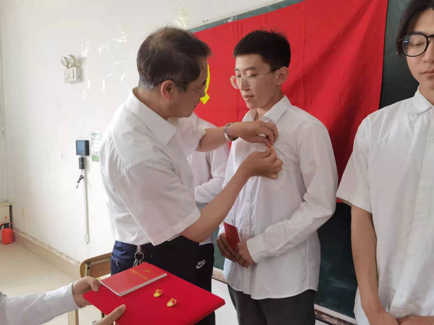 图 为新党员佩戴党员徽章现场
