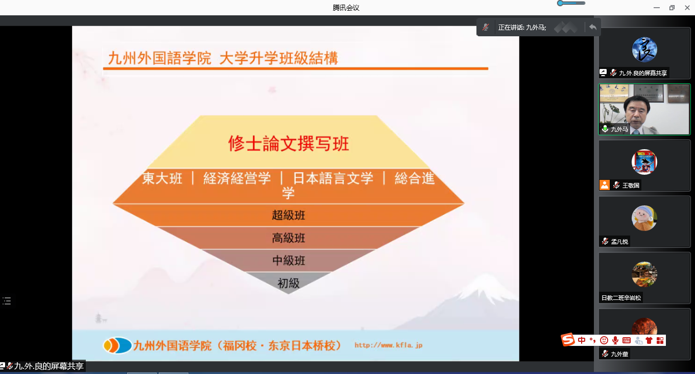 (王敬国/文)为提升我校人才培养质量,拓宽学生就业渠道,促进学生高端就业,拉动学风建设,满足学生出国深造需求,我校东语学院特邀日本九州外国语学院理事长马越雪夫,日本九州外国语学院中国事务所主任马志良于11月9日晚7点,以线上形式举办了“助力梦想,‘疫’路同行”出国留学指导云讲座活动。东语学院党委书记王淑杰,院长王琪,学院党委副书记李晓杰,正处级辅导员王敬国,日语专业2018、2019级本科生以及全体研究生参加了本次云讲座。云讲座由学院党委副书记李晓杰主持。