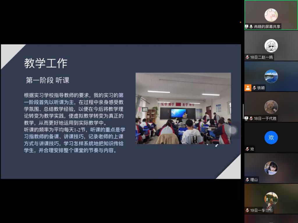 在大会中,首先各实习队代表通过PPT等展示方式,介绍了各自实习学校的基本情况以及在实习期间的工作、生活情况。从听课、备课、讲课到班主任实习工作等各项实习经历,同学们既表达了对各实习基地指导教师及东语学院带队教师们的感激之情,也表达了对实习学校学生的不舍和对教师职业的热爱。经过本次实习活动,同学们纷纷表示,通过各项实践教学活动,切身体会到了教师职业的意义和价值,也体会到了教师职业的艰辛与快乐,同时也对未来的教师生涯充满信心,做好准备去迎接未来的挑战!