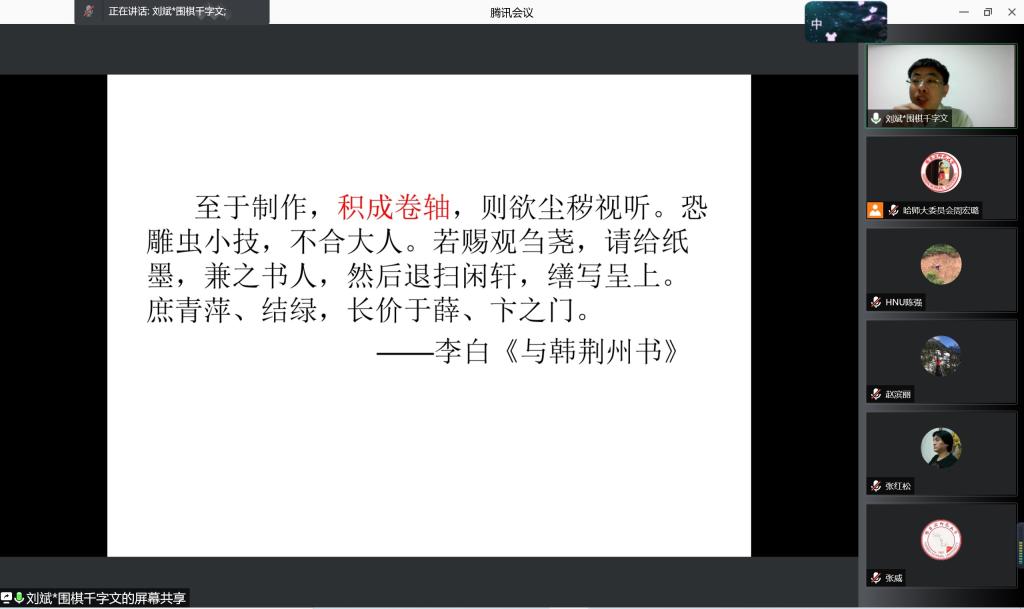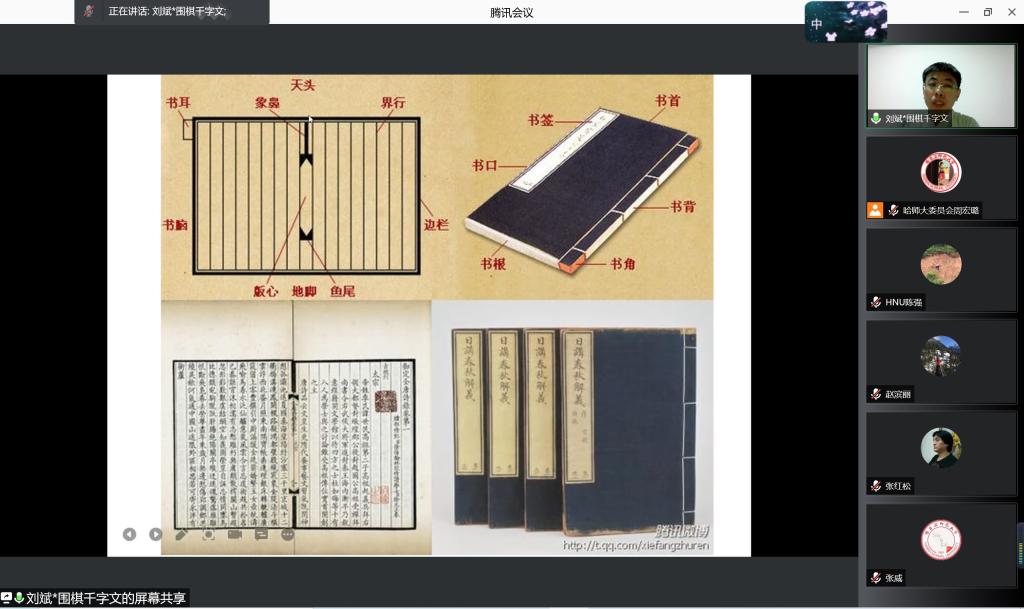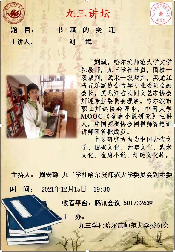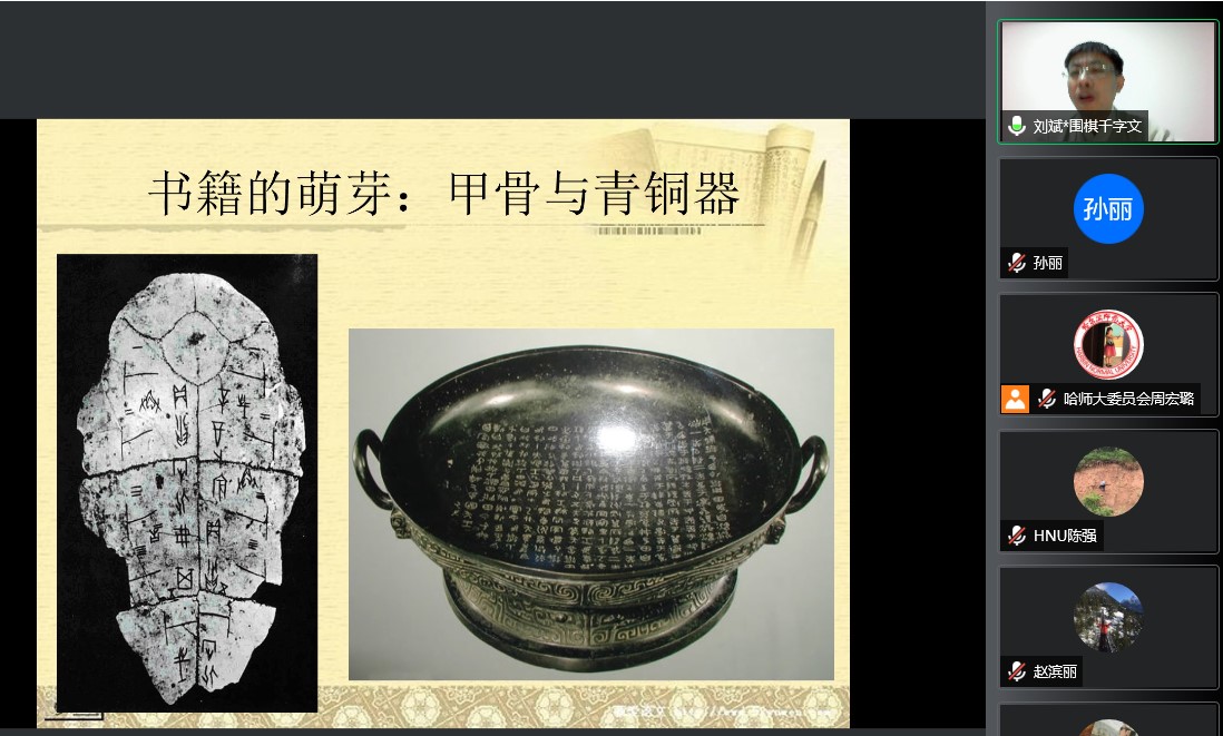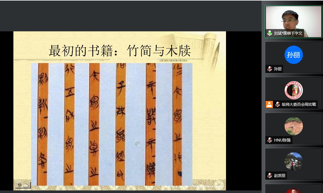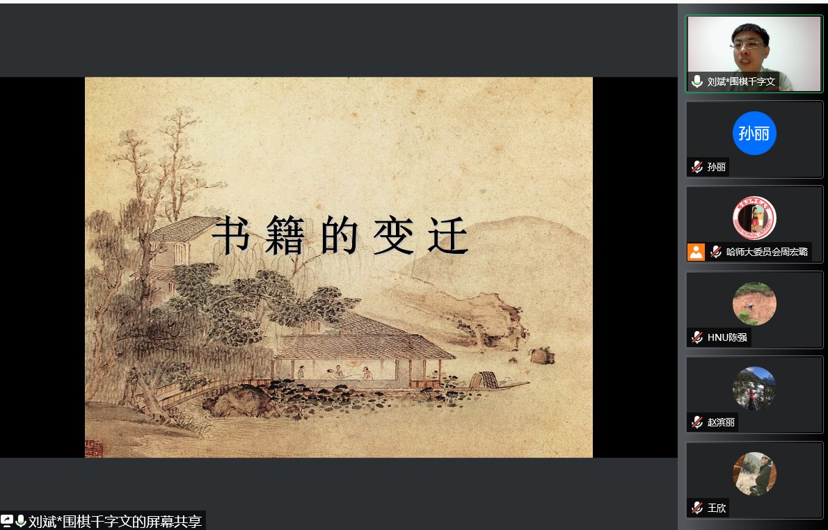 (文/孙丽)卷帙浩繁,书香弥漫,书籍的变化背后是中华文明的积淀,人类的进步就是踏着书籍的阶梯不懈攀爬的过程。哈尔滨师范大学“九三讲坛”第五期在12月15日晚七点半正式开讲。本次讲座特别邀请九三学社哈师大委员会委员、哈尔滨师范大学文学院刘斌老师为社员们带来的《书籍的变迁》,讲座由副主委周宏璐主持。对本次活动满怀期待的社员们早早地进入腾讯会议直播间,期待刘斌老师的精彩讲座。