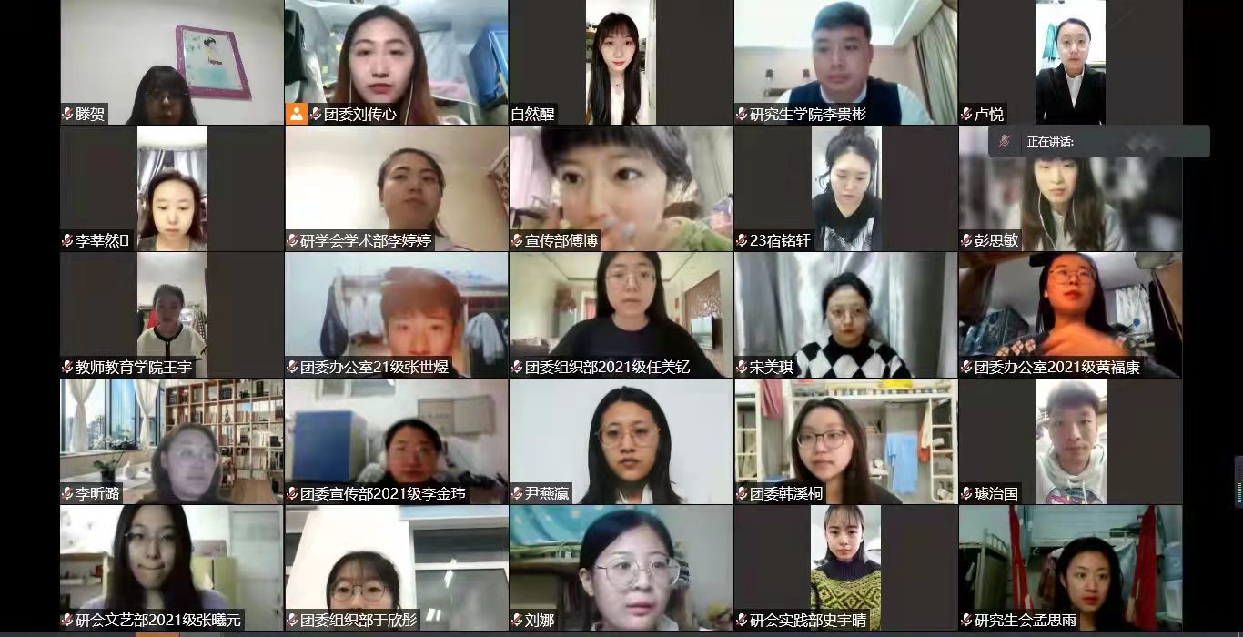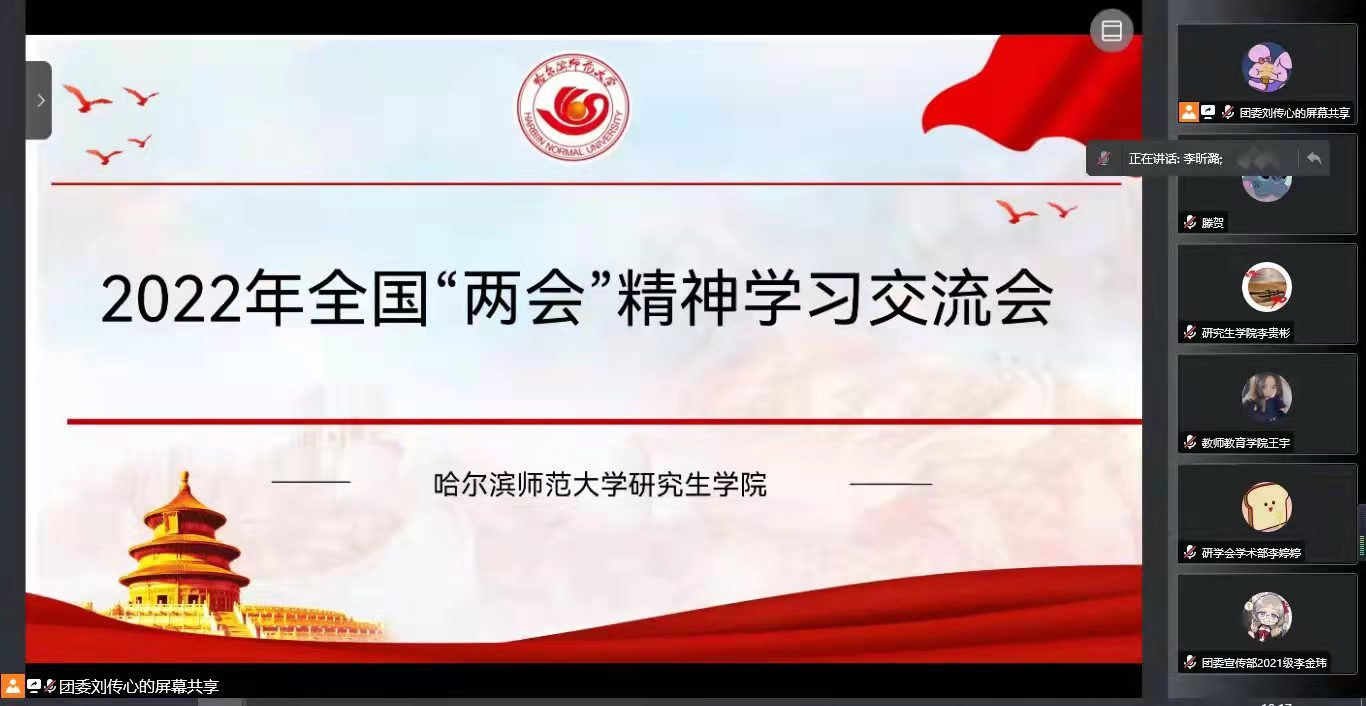 为深入贯彻学习2022年全国“两会”精神,切实把思想行动统一到党和国家重大决策部署上来,3月18日晚,研究生学院组织召开了“两会”精神学习交流会。本次大会采取网络会议的形式进行,学院党委书记李贵彬、教育管理办公室主任刘勇以及各学院研究生代表出席本次会议,会议由刘勇老师主持。