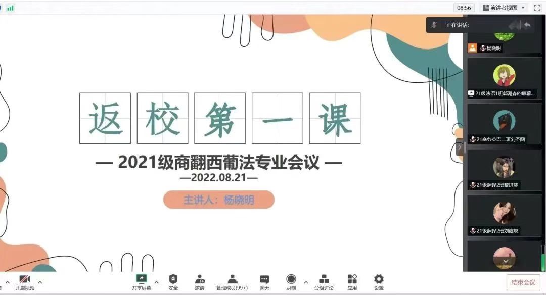 为落实学校疫情防控工作部署,谋划新学期学生管理工作,提升学院服务育人成效,8月21日,西语学院在线上召开2022年度秋季新学期学生安全教育暨疫情防控工作会议,学院各年级辅导员出席会议,全体学生参加会议。
