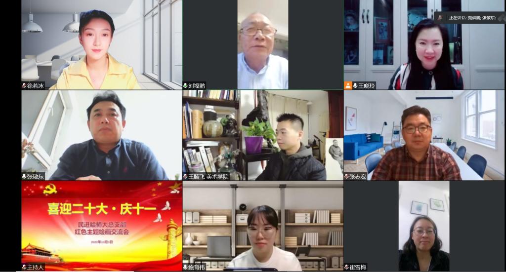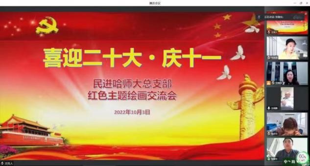 (王晓玲/文)金秋十月,丹桂飘香。在党的二十大即将召开之际,为响应民进中央提出的“奋进新征程,建功新时代”号召,民进哈师大总支举办“喜迎二十大—红色主题绘画赏析交流会”。民进省委宣传部部长张敬东、组织部部长桂寓洲,校党委常委、统战部部长张志宏出席活动。民进哈师大总支主委王晓玲主持交流会。