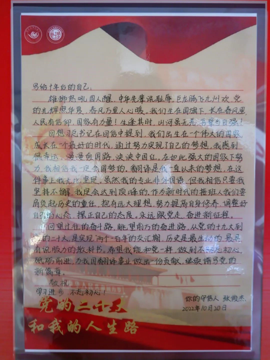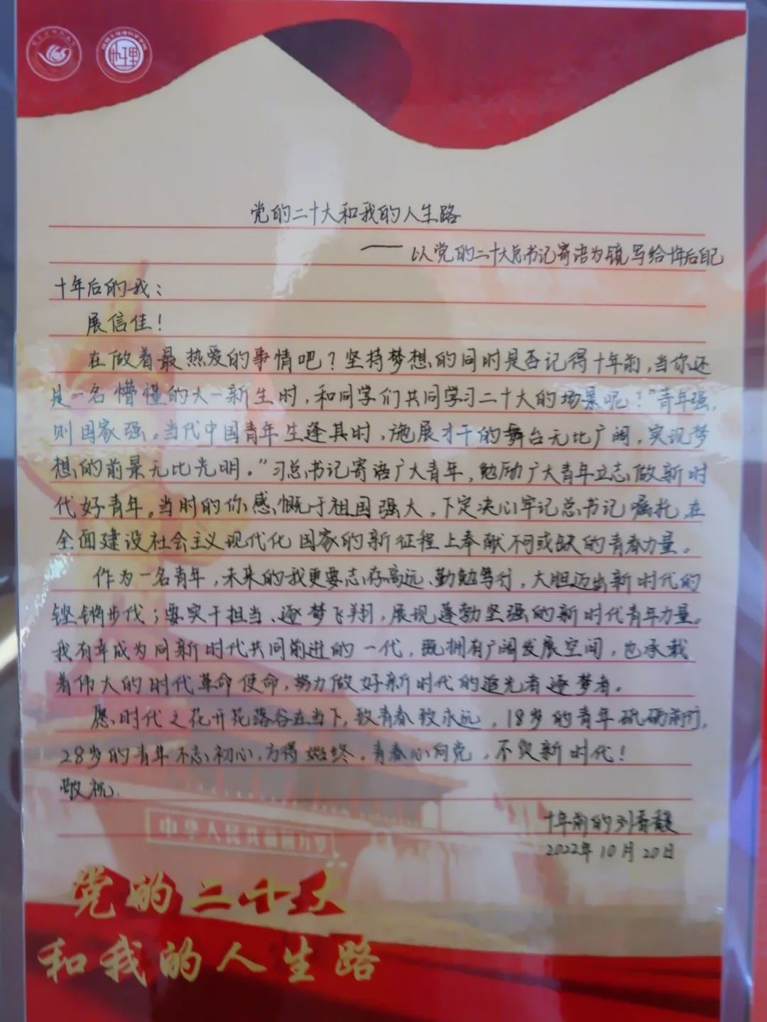 书信是通往心灵的快速列车,在书写信件的过程中,同学们可以慢下来,静静沉淀和思索,真实表达内心的声音。本次活动在让同学们深入学习领会党的二十大精神的同时,深切地感受到提笔写信的仪式感以及流淌在文字间的纸短情长,也为大家提供了一个记录成长、感受变化、表达感情的方式,有助于同学们释放压力、收获快乐、体会心灵感悟,积极面对生活。