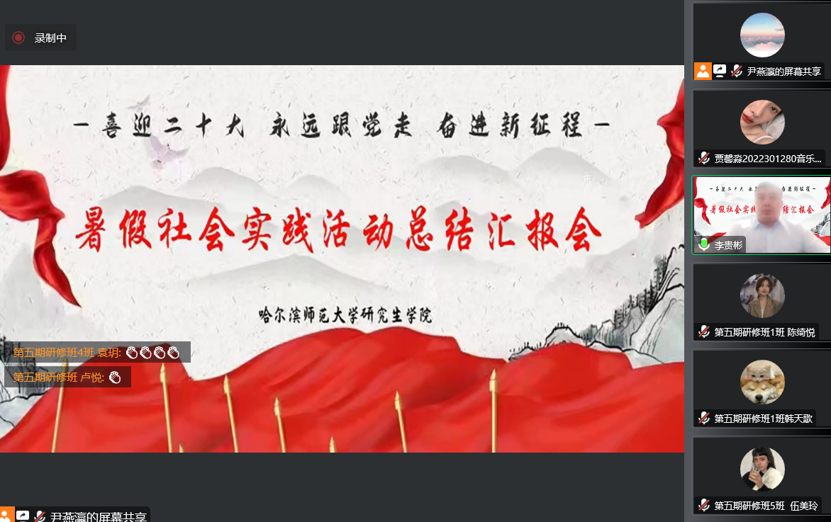 刘勇宣读了2022年暑假社会实践获奖作品名单。研修班成员代表高子贻、李梓源、吕沐阳等7位同学分别从模范人物寻访、志愿公益服务、家乡发展调研、少数民族文化等方面对暑假社会实践活动做了总结汇报。暑假社会实践活动增强了研究生服务社会的责任感与使命感,彰显了我校研究生的责任担当与青春力量,鼓励广大研究生同学继续在新征程上唱响青春之歌,在社会实践中砥砺奋进,谱写新时代青年服务人民、奉献社会的新篇章,用实际行动践行新使命。