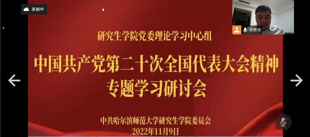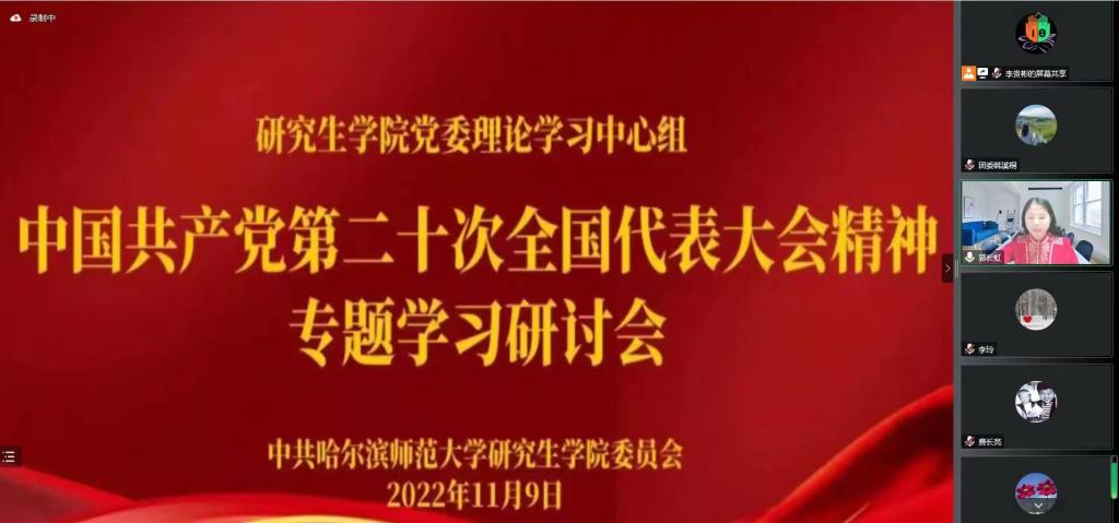 为深入贯彻落实中国共产党第二十次全国代表大会精神,进一步领会党的二十大报告的科学内涵和精神实质,2022年11月9日19点,研究生学院党委理论学习中心组召开了中国共产党第二十次全国代表大会精神线上专题学习研讨会。研究生学院党政班子成员及党员参加本次会议,会议由学院党委书记李贵彬主持。
