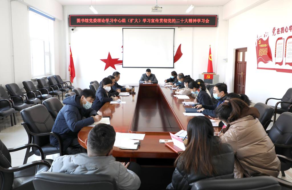 (陈晨/文)为学习宣传贯彻党的二十大精神,落实学校党委理论学习中心组学习要求,将党的二十大精神与图书馆服务育人中心工作紧密结合,2022年11月15日上午九点,图书馆党委理论学习中心组(扩大)在图书馆四楼会议室召开学习宣传贯彻党的二十大精神集中学习研讨会。图书馆班子成员、全体党支部书记及各部门主任参加会议,本次会议由党委书记乔峰主持。
