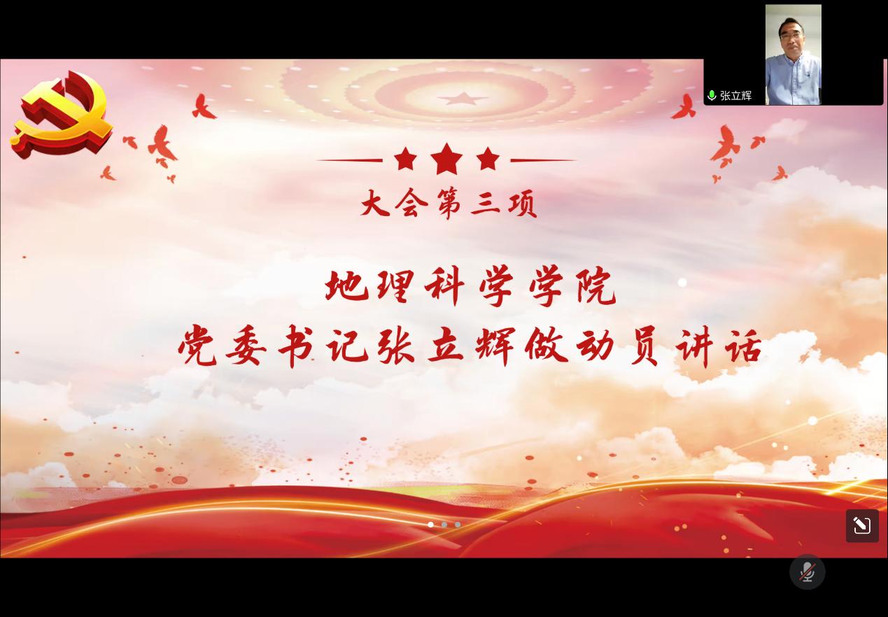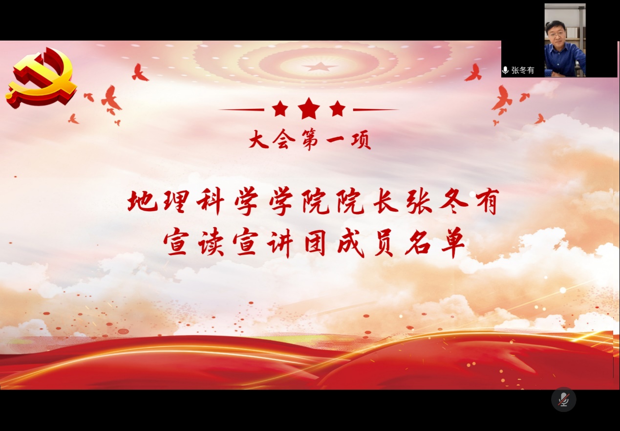 为深入学习贯彻宣传党的二十大精神,2022年11月22日晚,地理科学学院学习宣传贯彻党的二十大精神宣讲团成立动员会以腾讯会议的形式在线上举行。地理科学学院党委书记张立辉、院长张冬有、党政领导班子全体成员、各党支部书记、全体辅导员及宣讲团成员参加本次会议,会议由党委副书记陈莹莹主持。
