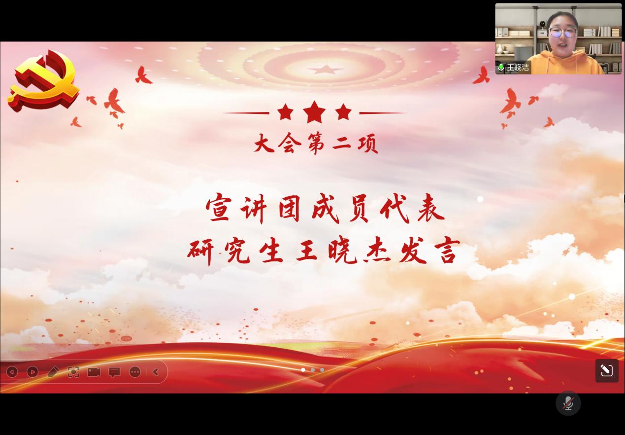 随后二十大宣讲团成员研究生王晓杰发言,她表示党的二十大报告用极不寻常,极不平凡来形容过去的年对党和国家事业取得的历史性成就发生的历史性变革进行了深刻的总结,并以中国式现代化全面推进中国中华民族伟大复兴,指明了前进方向。广大青年们是党领导下的青年群体,要坚定跟党走奋进新时代,要争做锐意进取、奋发有为、追求卓越的新时代追梦人,以蓬勃的朝气,昂扬的锐气和建功立业的勇气,为祖国贡献自己的青春力量,为祖国母亲献上青春的致意。
