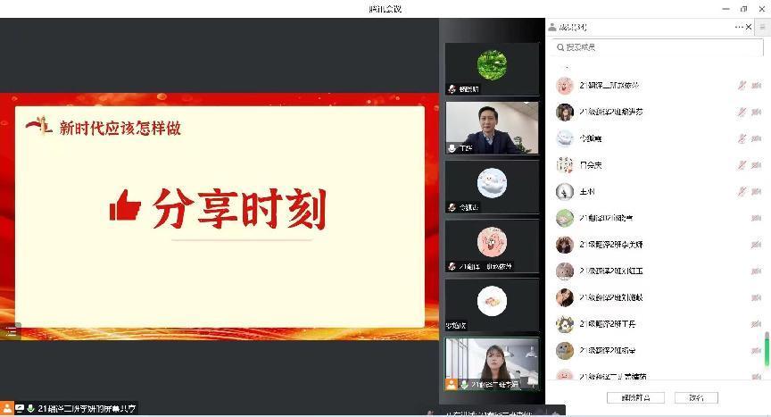 第三个环节是“分享时刻”。同学们围绕”新时代应该怎样做”这一话题分享自己的学习心得。“青年一代,必将大有可为,也必将大有作为。我们要在党的领导下,脚踏实地,一步一个脚印,托起中国梦。”李萌同学语句铿锵,激昂陈词。“我们这一代人,重任在身,当立鸿鹄之志,砥砺前行,始终把‘奋斗’二字写在同心筑梦的顽强拼搏里,身为‘后浪’我们更应该有所作为。”王鑫同学壮怀激烈,振奋人心。“羡子少年正得路,有如扶桑初日升”。如日初升的当代青年,是祖国的未来,民族的希望。