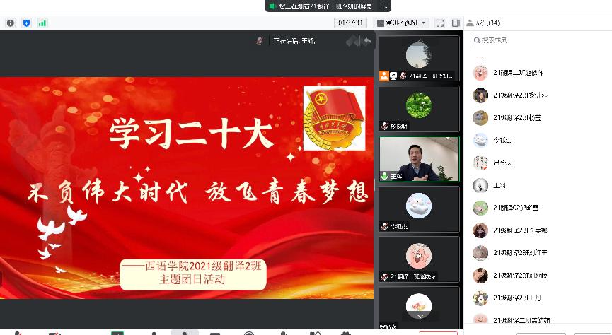 为深入学习贯彻党的二十大精神,深刻领悟习近平总书记对青年的殷切期望,激励同学们坚定不移听党话、跟党走,立志民族复兴,勇担时代使命,11月23日下午,西语学院2021级翻译2班通过线上、线下相结合的方式,开展“学习二十大,不负伟大时代,放飞青春梦想”主题团日活动。校党委常委、副校长王辉,西语学院党委书记王羽,西语学院党委副书记吕会庆、副处级辅导员杨晓明参加了此次活动。活动由翻译2班团支书李妍主持。