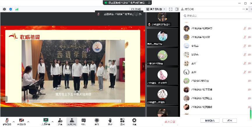 第四个环节是“歌唱祖国”。同学们自己弹奏、指挥、演唱,录制合成了小合唱《万疆》献礼祖国,这也唱出了同学们对祖国深情的爱。