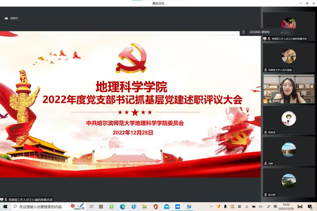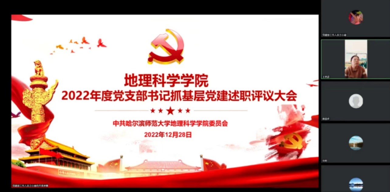 为深入贯彻落实党的二十大精神,加强党的基层组织建设,落实基层党建工作责任,根据学校党委组织部工作安排,结合我院实际工作情况,学院党委于2022年12月28日采用腾讯会议线上考评的方式开展2022年度党支部书记抓基层党建述职评议大会。地理科学学院党委书记张立辉,院长张冬有,党委副书记陈莹莹以及学院各党支部书记出席本次会议,本次会议由2020级辅导员郭昊昕主持。