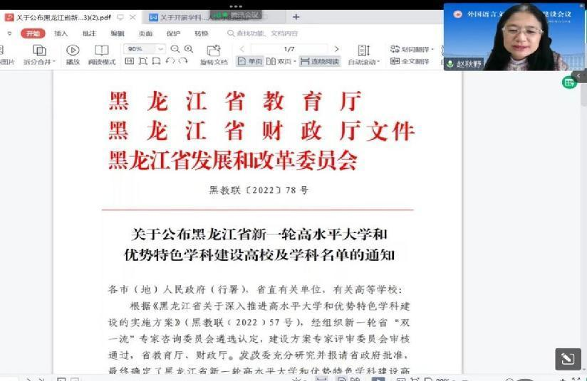 (董红晶/文)日前,经省政府批准,省教育厅、省财政厅、省发展和改革委员会正式公布新一轮高水平大学和优势特色学科建设高校及学科名单,我校成功入选国内一流大学建设高校(省高水平大学),外国语言文学学科入选国内一流学科建设学科(省优势特色学科),标志着本学科建设迈入了全新的发展阶段。为深入学习贯彻落实党的二十大和省第十三次党代会精神,服务龙江全面振兴和全方位振兴,进一步明确学科建设目标,凝聚优势力量,推动学科高质量发展,12月21日下午,外语学科带头人、各方向带头人及来自斯拉夫语学院、西语学院和东语学院的近百名教师齐聚云端,召开外国语言文学一级学科建设会议。会议分为两个阶段,第一阶段为全体会议,第二阶段为分组会议,会议持续近五个小时。
