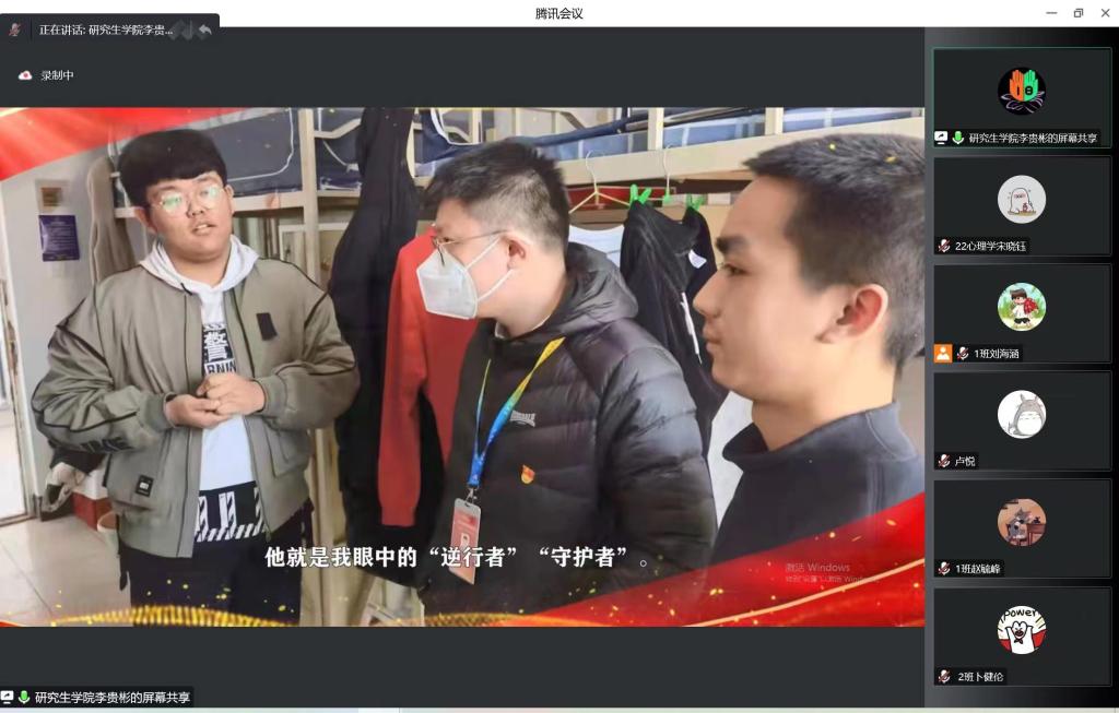 观看后,参会研究生畅谈了感悟,分享了心得,纷纷表示要向先进典型个人和集体学习,积极投身到抗击疫情的志愿服务当中,为学校、为家乡、为社会贡献力量。要向先进典型个人和集体学习,继承弘扬伟大抗疫精神,凝聚高质量发展的蓬勃力量。要向先进典型个人和集体学习,立足研究生实际,投身科研报国,坚定信念永跟党走。