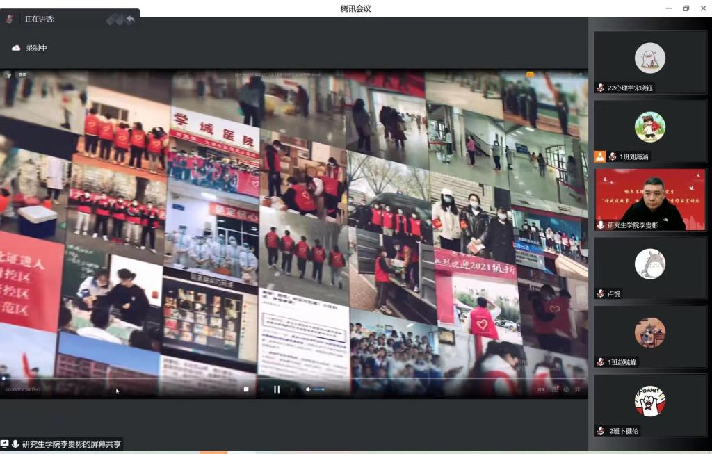 为弘扬抗击新冠肺炎疫情精神,进一步坚定师大学子战胜疫情的信念,发挥先进典型示范引领作用,近日,研究生学院组织哈师大研究生“讲战疫故事、悟初心使命”优秀作品线上宣讲观看活动。学校第五期深入学习宣传习近平新时代中国特色社会主义思想专题研修班全体学院、学校研究生干部、各学院研究生代表等分三场进行了观看,学院党委书记李贵彬主持观看活动。