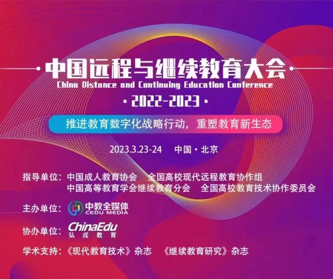 (李敏佳/文)3月23-24日,2022—2023(第八届)中国远程与继续教育大会在北京召开,本届大会由中国成人教育协会、全国高校现代远程教育协作组、中国高等教育学会继续教育分会、全国高校教育技术协作委员会指导,中教全媒体主办,弘成教育协办。我校《继续教育研究》期刊学术支持本次盛会,同时学术支持本会的还有清华大学主办的《现代教育技术》期刊。
