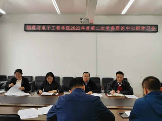 (刘智博/文)4月3日下午,物理与电子工程学院2023年度第二次党委理论中心组学习会在理工二号楼322室举行。学院党委书记邓铁男主持会议并讲话,学院党委理论学习中心组成员参加学习。