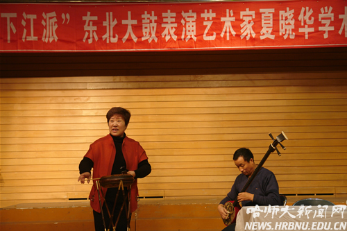 在宣传下江派大鼓的艺术成就过程中,夏老师也毫不讳言东北大鼓面临的发展困境。她坦诚地分析了造成困境的原因,同其他艺人强调外因不同,她更多地强调了东北大鼓艺术自身的原因,如传承乏人、艺人不重视自身的修行等。在两个小时的报告中,她还多次进行范唱表演,获得了师生的阵阵掌声。尤其是其演唱的段书《游湖借伞》,更是令人赞叹不已,不仅展示了东北大鼓无穷的艺术魅力,而且让人对她刻苦执着的求艺精神心生敬意。