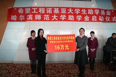 15日,由诺基亚(中国)投资有限公司捐资设立的“希望工程诺基亚大学生助学基金”发放仪式在我校松北校区图书馆一楼报告厅举行。我校家庭贫困的40名大学生得到了资助。该项目将在我校连续实施4年,资助款按学年划拨,累计助学金额将达到28万元整。我校党委副书记王广明和有关部门同志以及黑龙江省青少年发展基金会秘书长杨晶出席了发放仪式。