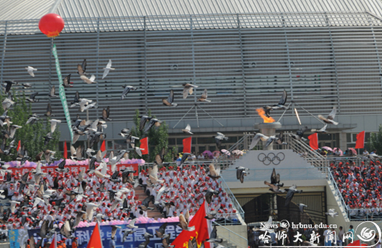随后大会进行了庄严而神圣的点燃圣火仪式。党委书记张少杰点燃手持火炬并向全场观众示意后,将火炬交给了2009年省大学生运动会乙组百米冠军、我校学生李鑫。李鑫接过火炬绕场一周后,在全场观众的注目下点燃了本届运动会的圣火。运动场上空立时气球飘舞,和平鸽绕场盘旋,全场掌声雷动,欢呼雀跃,整个开幕式达到了高潮。