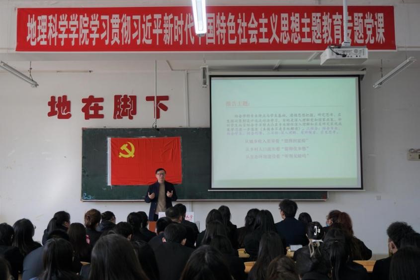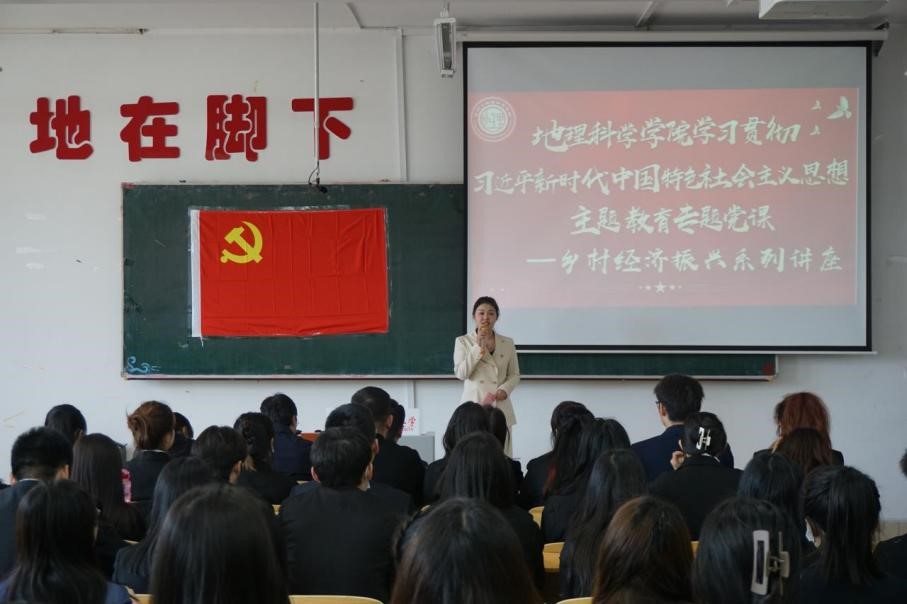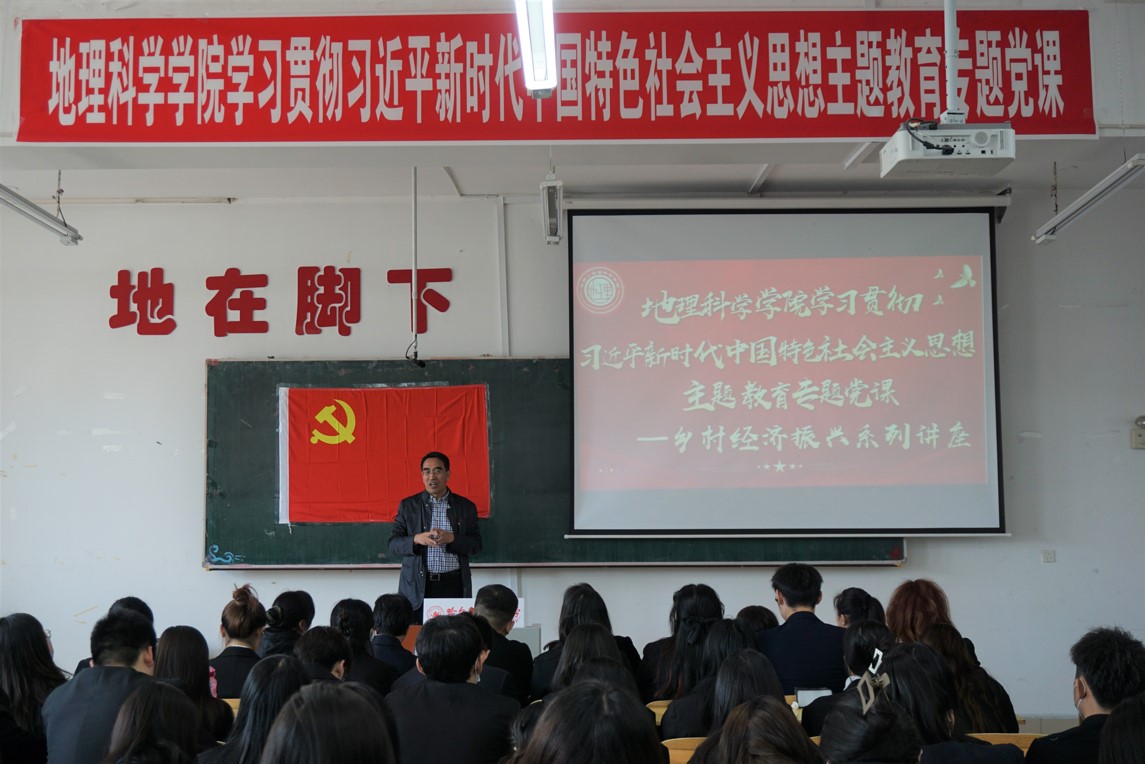 (宋歌/文)为深入学习贯彻习近平新时代中国特色社会主义思想,推动学院主题教育向深延伸到全体师生党员,落实“学思想、强党性、重实践、建新功”的总要求,实现把习近平新时代中国特色社会主义思想转化为坚定理想、锤炼党性和指导实践、推动工作的强大力量,地理科学学院于4月26日下午在理工三号楼220室举办学习贯彻习近平新时代中国特色社会主义思想主题教育之乡村经济振兴系列讲座。省委主题教育第十七巡回指导组成员郑国玺到会指导。本次讲座由地理科学学院博士生导师吴相利教授主讲,学生工作办主任、地信研究生第一党支部书记宋歌主持,地理科学学院党政领导班子、辅导员及全体学生党员参加本次讲座。
