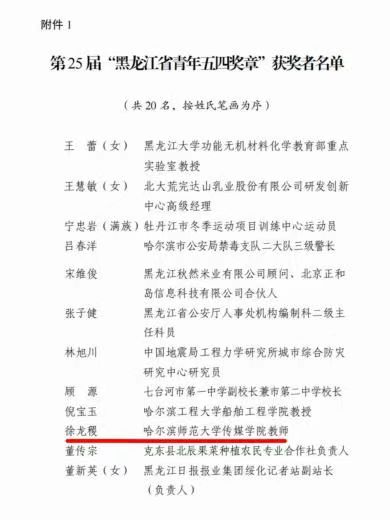 近日,共青团黑龙江省委、黑龙江省青联颁授第 25 届黑龙江省青年五四奖章,我校传媒学院青年教师徐龙稷荣获第二十五届黑龙江省五四青年奖章。