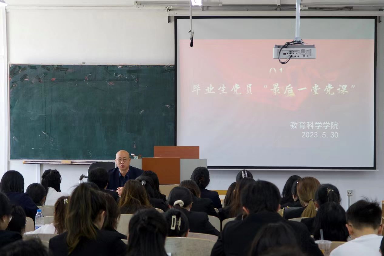 (刘恩权/文)为加强毕业生党员党性教育、党员意识教育、党的组织纪律教育和爱国主义教育,弘扬伟大建党精神,让毕业生党员感受到来自党组织的关心关怀,也让他们的党性修养、理想信念再一次得到提高和升华,使毕业生党员在今后的工作岗位中发挥先锋模范作用。教育科学学院党委于5月30日在社科楼西区329开展毕业生党员再教育活动——2023届毕业生最后一堂党课。学院党委书记刘兆华作题为“筑牢初心之魂,永担使命之任”的主题党课,副处级辅导员刘恩权、全体2023届毕业生党员参加本次党课。