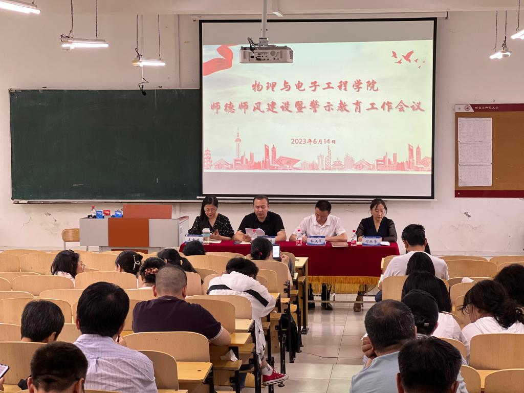 (刘智博/文)为全面贯彻落实党的二十大精神,深入学习贯彻习近平总书记关于教育的重要论述和教师队伍建设的重要指示精神,深入推进师德师风教育,不断提升学院教师思想政治和师德师风建设水平。6月14日下午,物理与电子工程学院师德师风建设暨警示教育工作会议在理工二号楼211室召开,学院全体教职工参加会议,会议由学院副院长付淑芳主持。