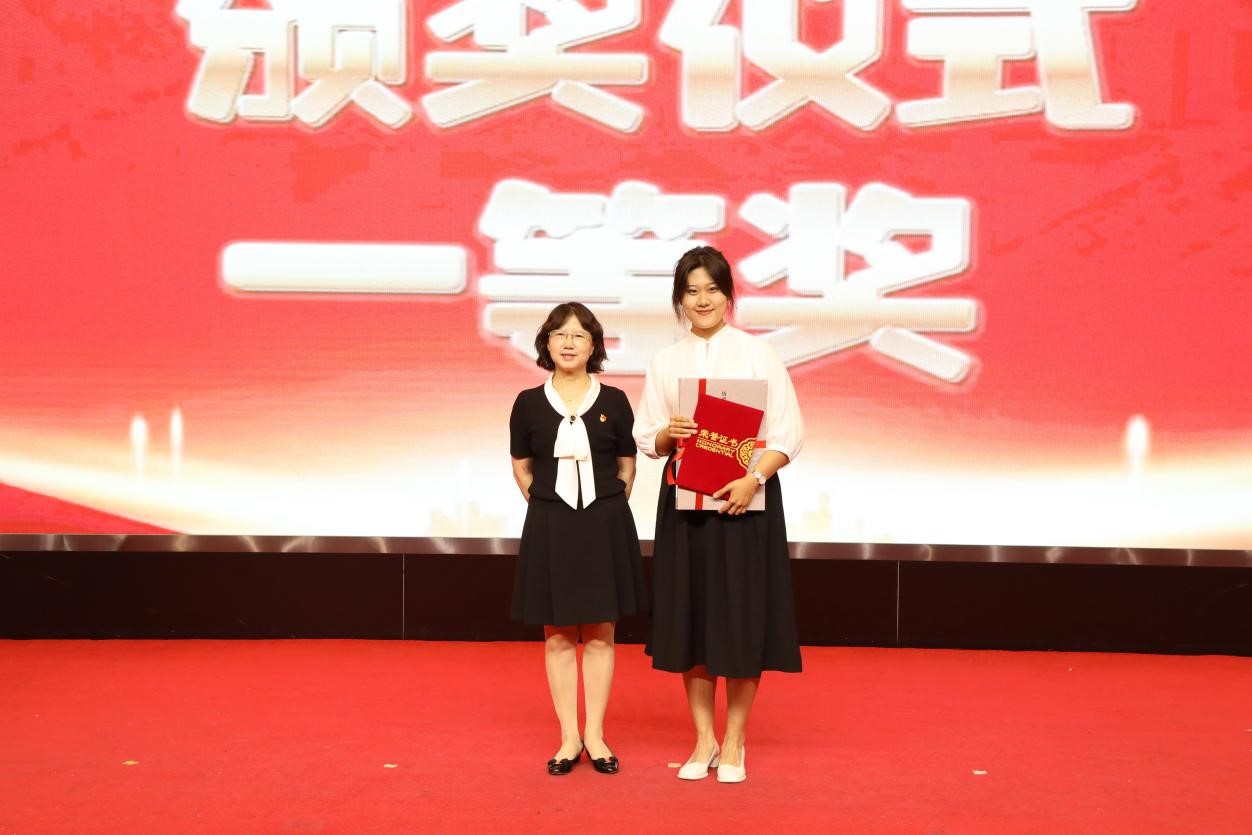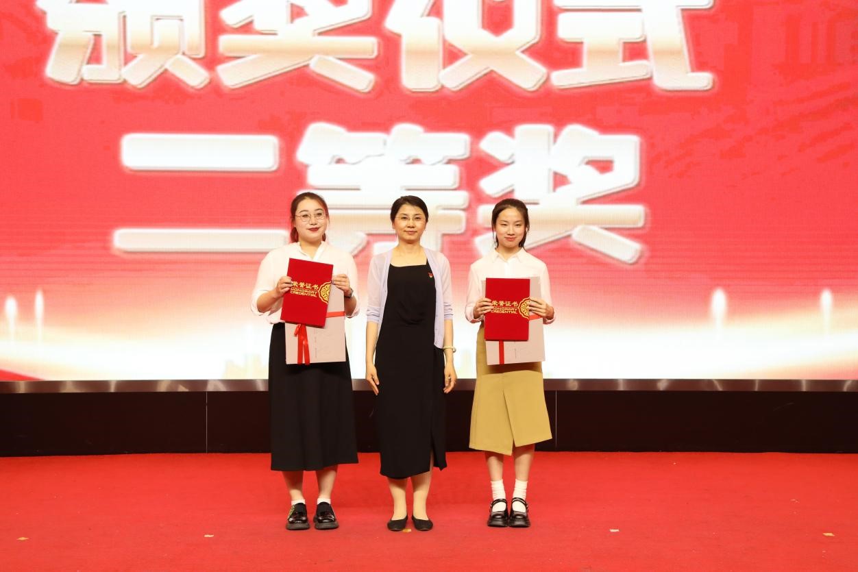 校主题教育领导小组副组长、校党委副书记李庆霞为获奖同学颁发一等奖
