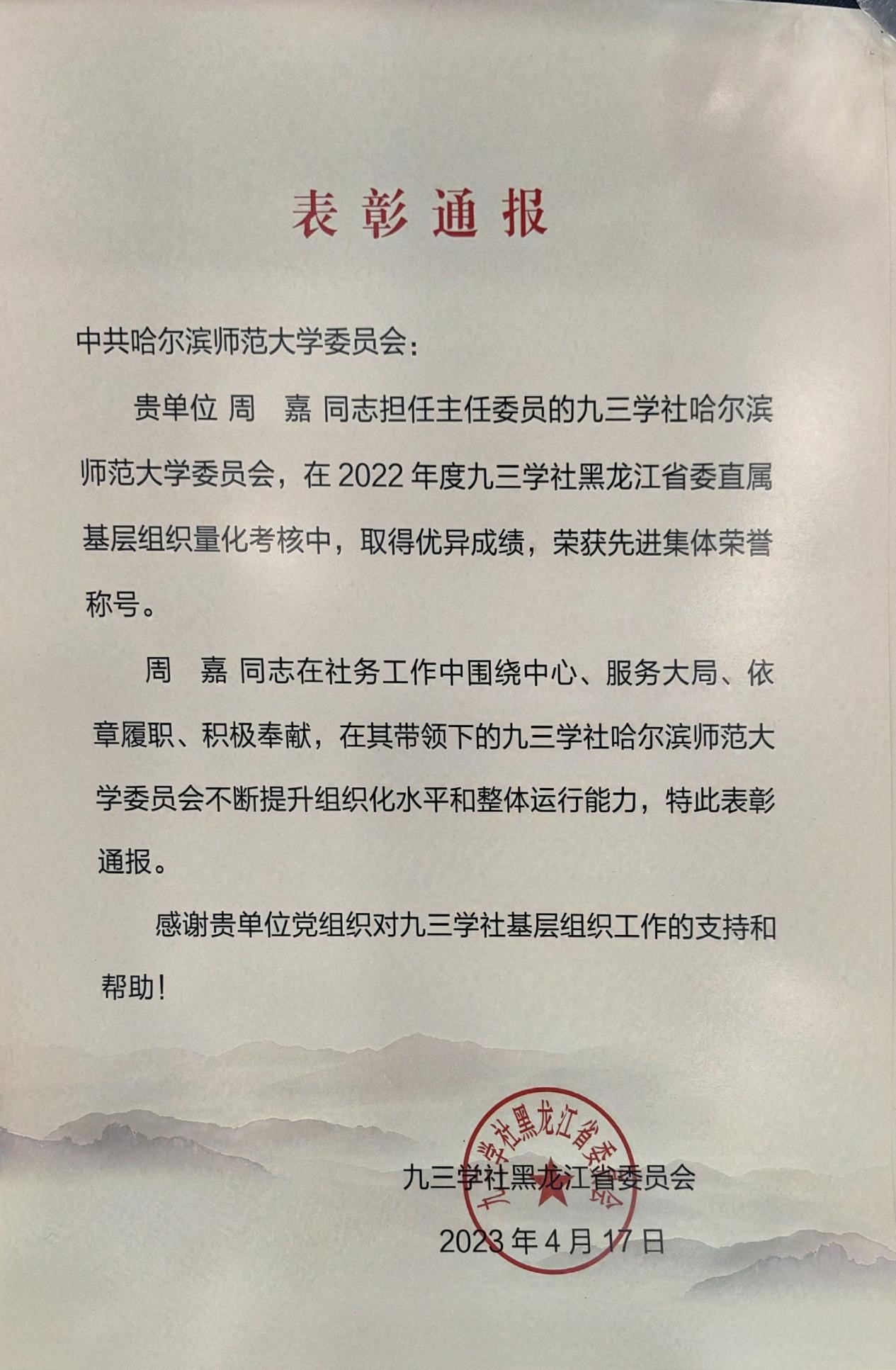 (周宏璐/文)近日,九三学社黑龙江省委通报对42个省直属基层组织量化考核结果,九三学社哈尔滨师范大学委员会取得量化考核排名第三的优异成绩,荣获九三学社黑龙江省委授予的“先进集体”荣誉称号。