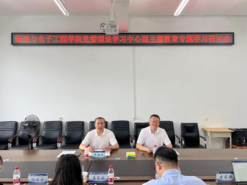 (刘智博/文)6月21日下午,物理与电子工程学院党委理论学习中心组主题教育专题学习研讨会在理工二号楼322室举行。学院党委书记邓铁男主持会议,学院党委理论学习中心组全体成员参加学习。