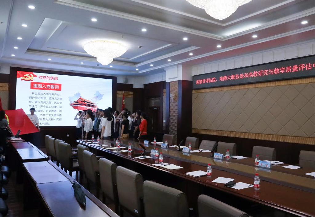 (刘小琳/文)为弘扬伟大建党精神,引领广大党员干部铸牢政治忠诚、强化责任担当,推动学习贯彻习近平新时代中国特色社会主义思想主题教育走实走深。6月27日下午,在行知楼0107会议室,黑龙江省教育评估院院长景丽英一行11人来到哈尔滨师范大学,与我校教务处和高教研究与教学质量评估中心全体党员联合开展“联学共建凝合力,主题党日践初心”主题党日活动。会议由教务处处长姜洪泉主持。