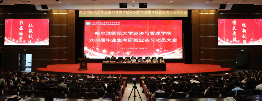 为深入学习贯彻党的二十大精神,落实教育部关于高校毕业生就业工作决策部署,按照哈尔滨师范大学工作落实年“高质量充分就业”工作要求,充分调动学生实习就业考研的积极性,帮助学生提前合理规划考研目标、科学制定实习就业计划,促进学生高质量就业发展。6月26日下午,经济与管理学院在科学会堂举行2024届毕业生实习就业考研动员大会。学院党委书记蒙国军、院长徐光、副书记翟力、副院长李桃、副院长祁凯、教师代表王海成、各系主任及系副主任、2020级辅导员徐子恒、康振超、实习基地代表杨滨华、企业代表崔莹及2024届全体毕业生参加会议。2020级辅导员康振超主持会议。