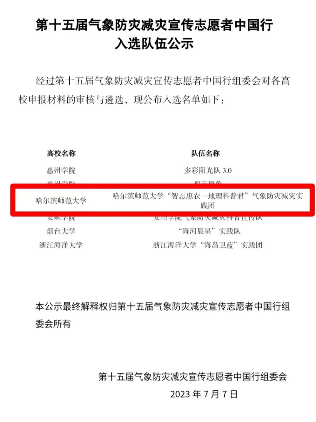 地理科学学院“智志惠农一地理科普君"气象防灾减灾实践团入选“气象防灾减灾宣传志愿者中国行”专项活动。