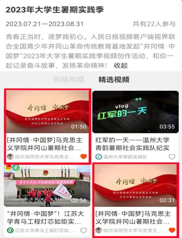 实践团及时将社会实践所获得的感性认知转化为理论宣讲的动力之源。团队成员充分学习领会井冈山精神的深刻内涵,以马克思主义学院“学讲研用”特色宣讲模式为基底,不断完善和丰富实践项目,将井冈山精神的深刻内涵充分运用到理论宣讲中。团队成员不断扩大理论宣讲的覆盖面,“用”好井冈山精神,丰富宣讲资源。实践团在新媒体宣传方面成果显著,截止至2023年8月2日,抖音短视频平台发布视频均获得3000+的浏览量,获得团中央井冈山教育基地的点赞;在新浪微博平台进行成果展示与理论分享,篇均浏览量500+且获得团中央井冈山教育基地的转发;在《人民日报》视频平台《视界》“2023年大学生暑期实践季”专题中,三个视频被纳入精选视频行列。