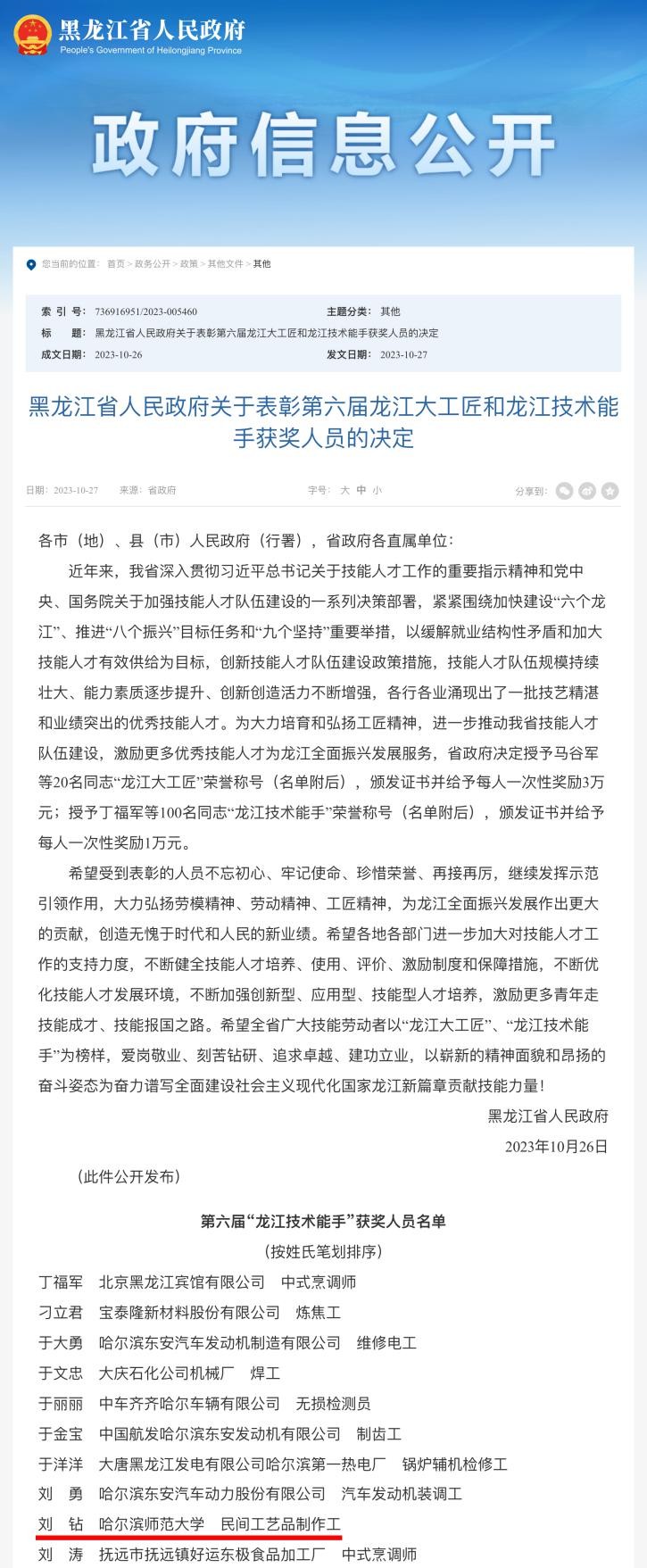 近日,黑龙江省人民政府发表了关于表彰第六届龙江大工匠和龙江技术能手获奖人员的决定,我校美术学院副院长刘钻教授荣获第六届“龙江技术能手”称号。近年来,我省深入贯彻习近平总书记关于技能人才工作的重要指示精神和党中央、国务院关于加强技能人才队伍建设的一系列决策部署,紧紧围绕加快建设“六个龙江”、推进“八个振兴”目标任务和“九个坚持”重要举措,以缓解就业结构性矛盾和加大技能人才有效供给为目标,创新技能人才队伍建设政策措施,技能人才队伍规模持续壮大、能力素质逐步提升、创新创造活力不断增强,各行各业涌现出了一批技艺精湛和业绩突出的优秀技能人才。为大力培育和弘扬工匠精神,进一步推动我省技能人才队伍建设,激励更多优秀技能人才为龙江全面振兴发展服务,省政府决定授予我校刘钻等100名同志“龙江技术能手”荣誉称号。