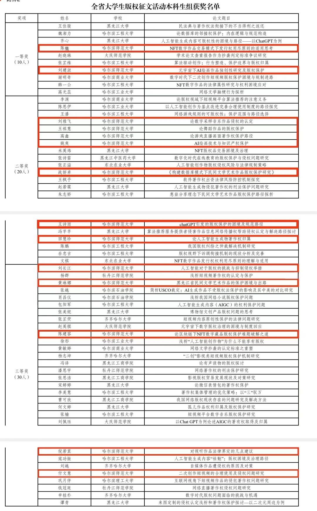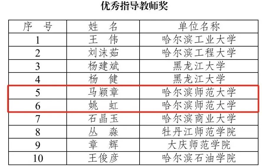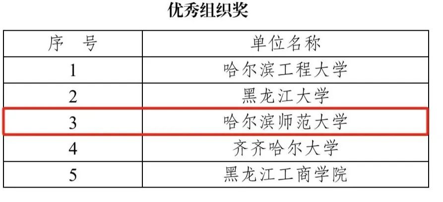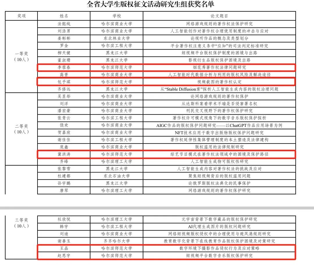 在我校师生共同努力下,经查重审核、专家匿名评审、主办单位审定同意,我校荣获“优秀组织奖”,法学院教师马颖章老师和姚虹老师荣获“优秀指导教师奖”;在本科生组、研究生组两个组别中,哈师大学子取得优异成绩,其中一等奖4人、二等奖8人和三等奖7人。获奖名单如下: