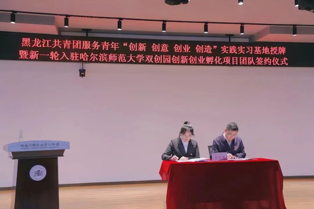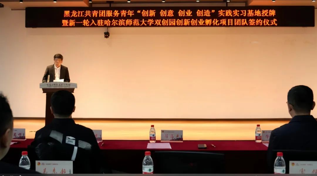 (刘强/文)为深入贯彻落实习近平总书记在新时代推动东北全面振兴座谈会上的重要讲话精神,学校团委积极响应团省委相关要求,推进学校双创园建设,近日,园区成功入选黑龙江共青团服务青年“创新创意创业创造”(以下简称“四创”)实践实习基地。12月8日下午,我校在双创园二楼汇报厅举办黑龙江共青团服务青年“四创”实践实习基地授牌暨新一轮入驻哈尔滨师范大学双创园创新创业孵化项目团队签约仪式。团省委副书记陈海平、学校部部长林显东出席活动,学校团委、创新创业园发展有限公司负责同志,新一轮入驻双创园项目团队师生参加活动。仪式由校团委书记刘春玲主持。