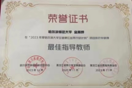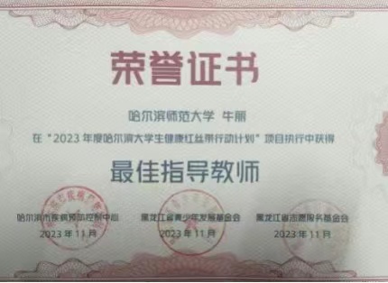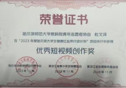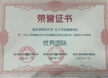2023年12月1日,在由黑龙江省防治艾滋病工作委员会主办,省卫生健康委员会、省教育厅等多家单位联合承办的2023年“世界艾滋病日”暨“性病防治主题宣传周”活动中,我校行知青年志愿者协会(现为行知青年志愿者中心)、我校红十字志愿服务队、我校教育科学学院青年志愿者协会荣获“2023年度哈尔滨大学生健康红丝带行动计划”优秀团队称号;我校文学院辅导员金雨婷、教育科学学院辅导员牛丽荣获最佳指导教师称号;我校教育科学学院青年志愿者协会杜文泽荣获优秀短视频创作奖。