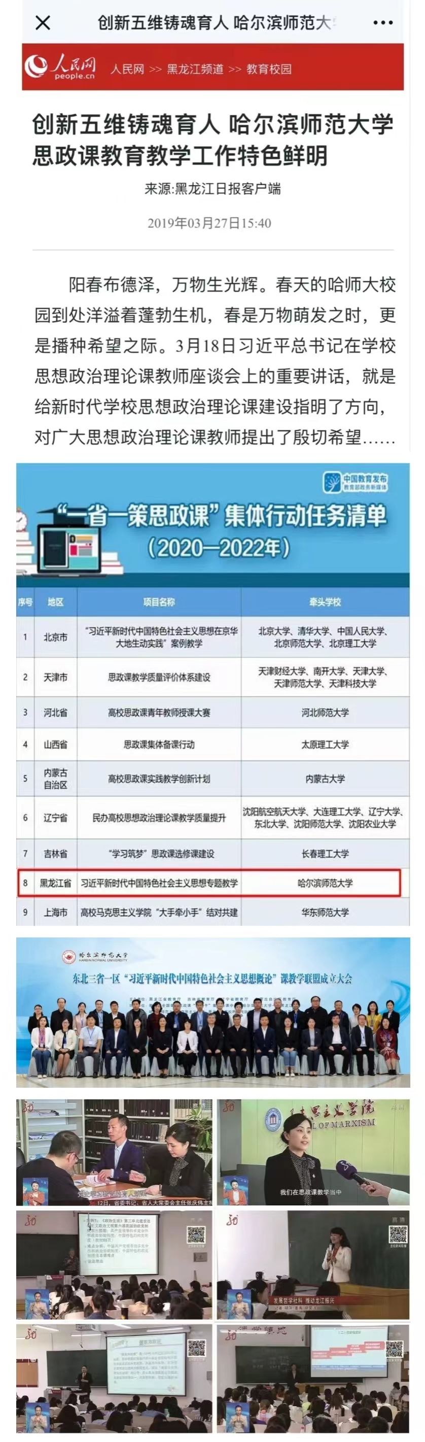 习近平总书记在学校思想政治理论课教师座谈会上就如何办好新时代思政课做出重要部署。五年来,哈尔滨师范大学马克思主义学院在学校党委的正确领导下,深入贯彻落实习近平总书记“3.18”重要讲话精神,积极谋划、主动作为,不断推动思政课改革创新,思政课的思想性、理论性和亲和力、针对性不断增强,学生对思政课“满意度”“获得感”不断提升。