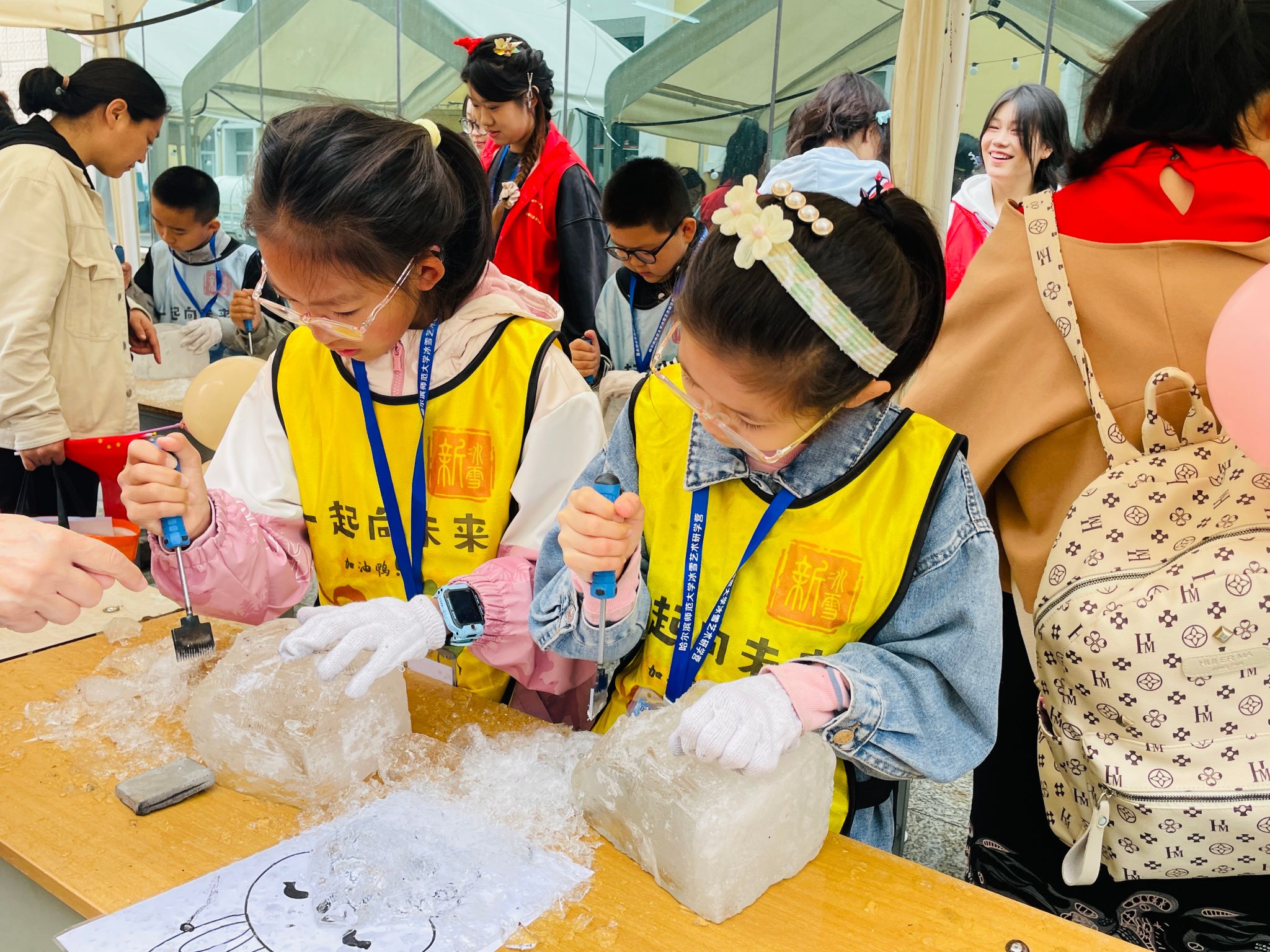活动特别设置了“五色五育”——红色·德育、蓝色·智育、白色·体育、绿色·美育、黄色·劳育五项研学内容,开展10个研学课程,分别在6月1日和8日分两次系列展开。通过项目式、启发式实践教学,引导中小学生沉浸式体验。开营仪式和课程思政培养孩子们行知精神、践行社会主义核心价值观;文旅桌游、Potentital-Inspiring blocks编程积木、冰雪雕刻课程培养孩子们创新意识、创造思维;地图寻宝、人体运动构造课程培养孩子们团队意识、拼搏精神;锤草印花、DIY手绘亚麻袋,非遗漂漆扇、剪纸课程培养孩子们动手能力、渐进思维。参与“五色五育”研学活动的家长和孩子们更加直观地了解“五育并举”育人体系对全面发展素质教育的重要作用,并对高校落实立德树人根本任务,推进大中小学思政课一体化建设,推动新时代学校思政课改革创新具有了全新认知和助力基础。