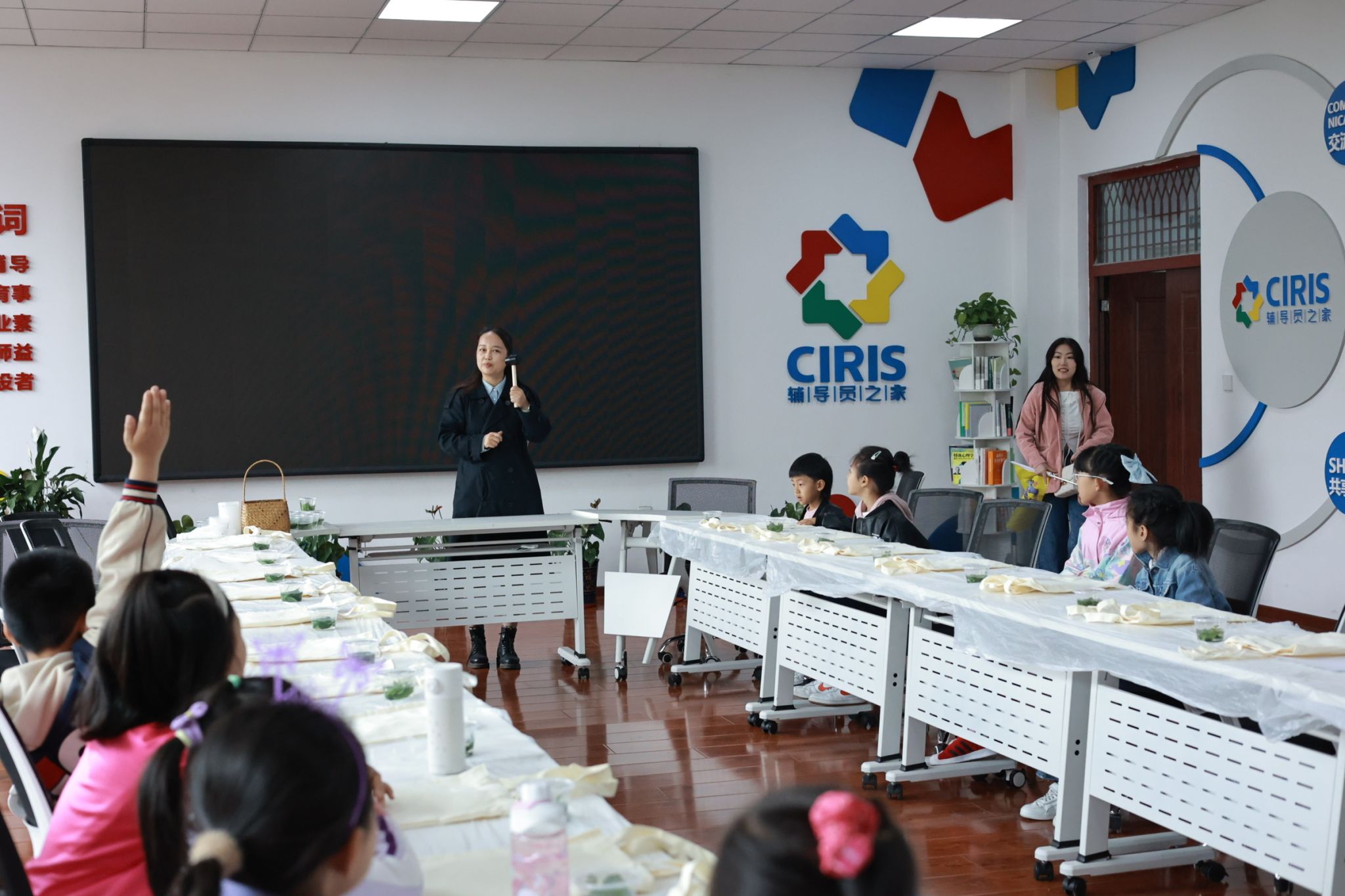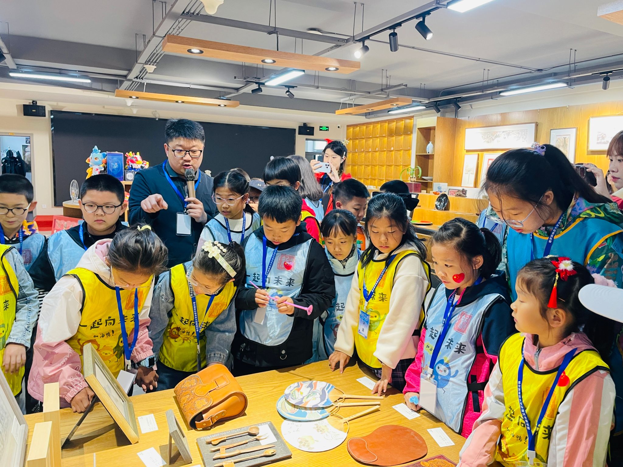 在两个校区的研学开营仪式上,工会常务副主席杨世君、副主席李立平分别代表学校发出“一起向未来”的倡议,倡议广大青少年善于实践、敢于探索,用好奇的眼睛去观察世界,用勇敢的心去面对挑战,用快乐的笑容去迎接每一天。孩子们在研学导师和大学生青年志愿者带领下,仔细聆听研学知识讲解,认真观察并记录项目设计,学习感受非物遗文化魅力,激发科学文化体育艺术创新思维,亲自动手实践+DIY制作。孩子们沉浸其中,乐不思蜀。家长们纷纷表示:“今天‘六一’儿童节,孩子来这里研学,既玩得开心也学到了知识,活动体验非常好。”